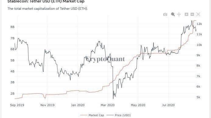 “为了弥补随着比特币价格上涨而产生的购买力不足,新的法币需要流入市场,也就是说需要增加稳定币的供应量。”