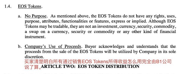 在EOS的销售协议中,写得明明白白,EOS没有任何的权利、价值,不是投资,也不是货币,更不是证券,销售所得全凭开发公司Block.one(简称B1)处置,B1创始人Brendan Blumer(简称BB)也多次强调,EOS的发行是销售协议,而不是募资协议。