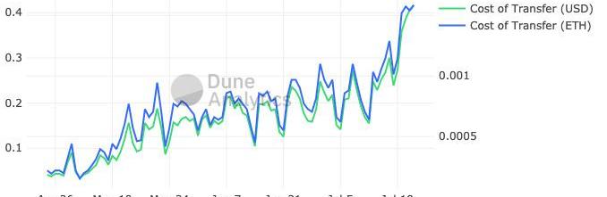 下图展示了以太坊区块链上ETH和美元的交易成本走势情况,资料来源DuneAnalytics: