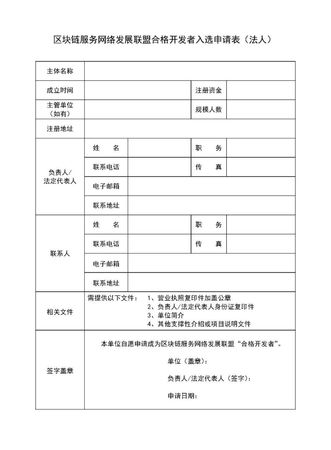 申请者向联盟开发者委员会提交入选申请材料,包括入选申请表、身份证明文件、营业执照复印件等相关文件。申请表填写完整后做成PDF文件,并与其他支撑文件打包发至:developer@bsnbase.com;