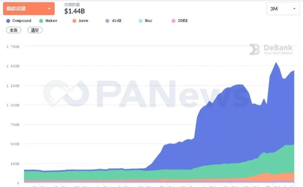 Compound中借贷量的增长并没有引起投资者的热情,在这一个月里,其治理代币COMP的价格接近腰斩,创下新低。在上一个月的DeFi月报中PANews也提到COMP可能存在泡沫,前期流通量的不足可能过高的推升了COMP的价格。并且,借贷市场的借款或存款并没能完全反应产品的使用情况。为了获取平台的治理代币,同一个人可能对同一币种进行反复存款、贷款。以DAI为例,目前DAI的总供应量只有3.8亿,而Compound中DAI的存款就有10.6亿,这意味着有相当多的DAI被用于在Compound中反复的存款、贷款。