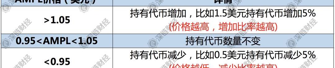 简单来讲,AMPL是一种算法稳定币。但是它有一个特性,每天早上10点币价高于1.05美元时,用户持有的AMPL会按照一定比率增加;当币价小于0.95美元时,用户持有的AMPL就会按照一定比率减少。