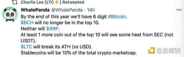 LTC创始人李启威今日转发WhalePanda的推文,WhalePanda表示,1、到2021年底,我们将看到10万美金的比特币;2、BCH和XRP市值将跌出前10名;3、前10名中至少还有1个币会受到SEC诉讼(不是USDT);4、LTC将突破历史新高;5、稳定币将占加密货币总市值的10%。?