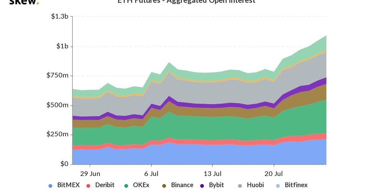 自6月20日以来,以太坊期货的未平仓合约增加了近30%,从不到8亿美元增加到近11亿美元。未平仓合约是一项重要指标,因为它衡量的是发行人和买家在期货合约中仍处于到期日的原始金额。相比之下,期货交易量衡量的是在给定时期内正在交易的现有期货合约的价值。加密货币交易所OKEx目前保持着最大的未平仓头寸,超过2.9亿美元。