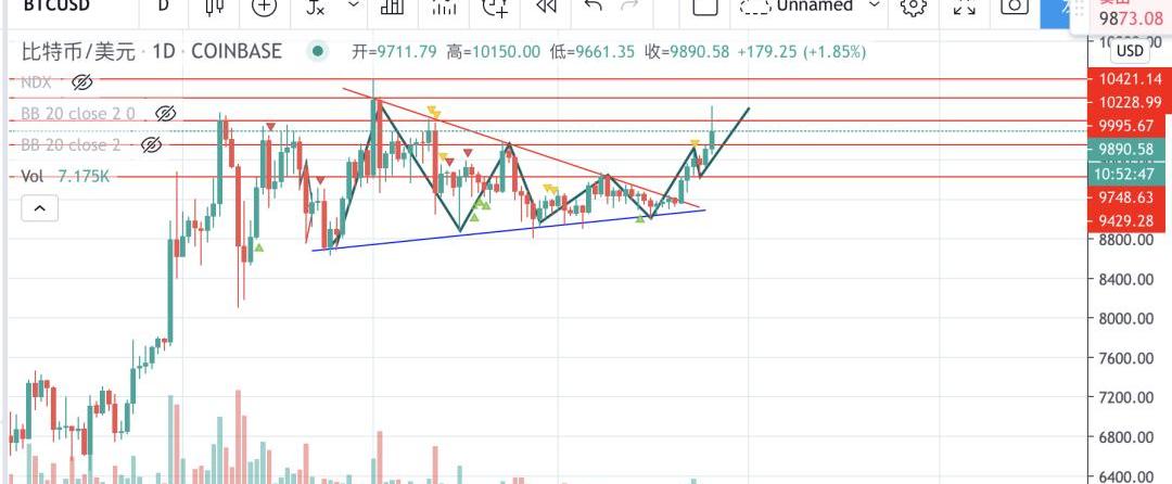 回到技术盘面,BTC周线收得很漂亮,放量突破9800美金的压力位,在10000美金遇阻插针后依然坚挺,这是强势的市场信号,预计会在9800-10000美金之间震荡修复之后,再去挑战10000美金,短线依然看涨。