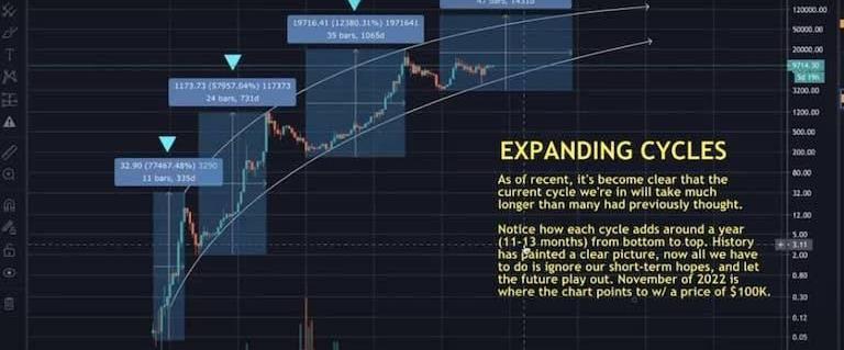 第一个这样的周期发生在2010年左右,当时“我们开始得到比特币的真实价格数据,真实交易量,第一批主要的交易所开始上线比特币交易。”第一个周期长达11个月。接下来的每个周期都会增加大约一年的时间,使每一次周期持续的时间都更长,因此我把它称作“扩张周期”。