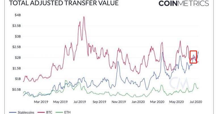 CoinMetrics数据显示,在2020年6月,使用稳定币进行的交易金额已开始超过比特币,这对稳定币来说是一个历史性的事件。