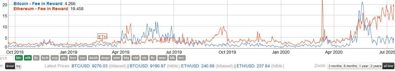 7月份以来,比特币矿工手续费奖励占挖矿奖励的比例,呈现下降趋势,目前占比为4.2%左右,但是以太坊矿工手续费奖励却呈现出暴发趋势,占比一度达到19.4%,这一数据并未出现下跌趋势,预计随着DeFi持续火爆,该数据会达到更高的状态。