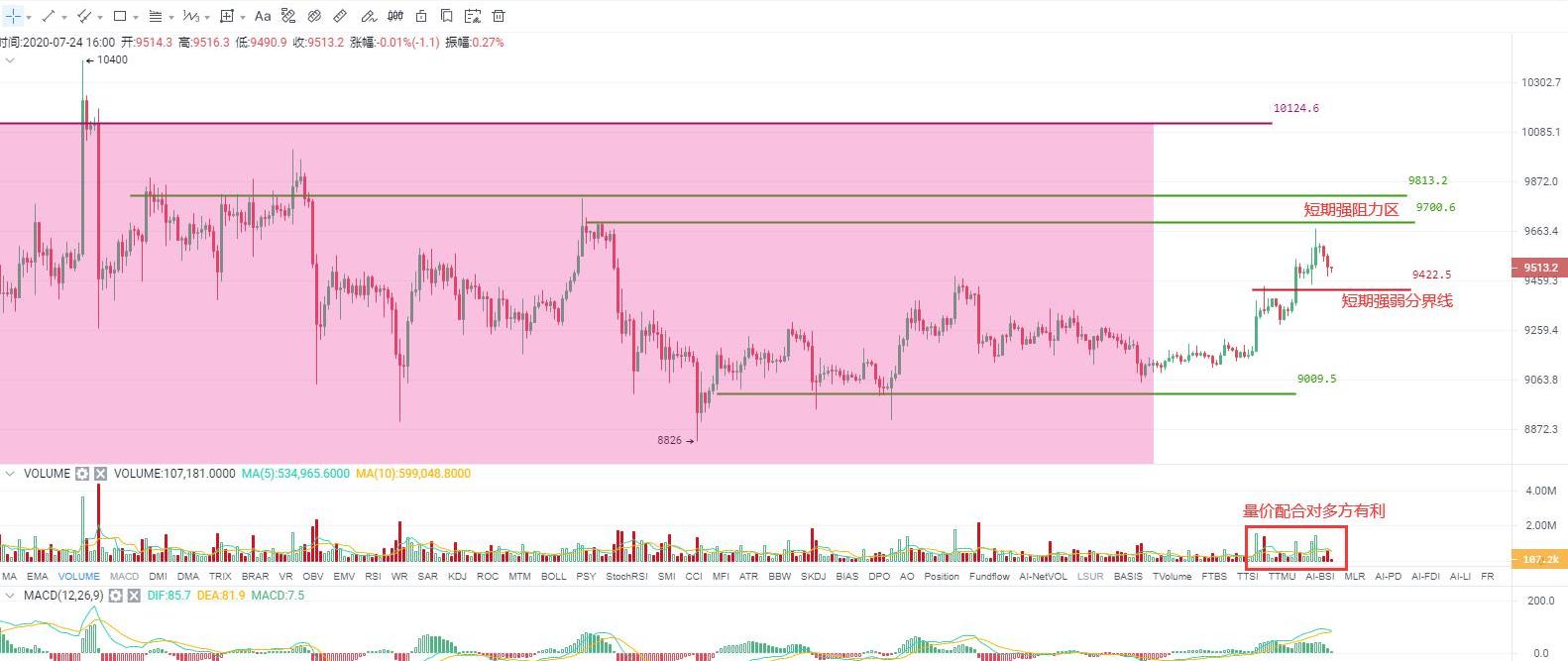 对于未来两天的行情我是这样看的,市场的做多情绪刚刚被激发出来,短期不易结束,而且从现在币价的表现也可以看出虽有回落,但出于可控状态。所谓可控是指币价已经在9420这一关键支撑上方出现止跌企稳现象,于此同时这几天的量价配合也比较健康,呈现出价涨放量,价跌缩量的状态。