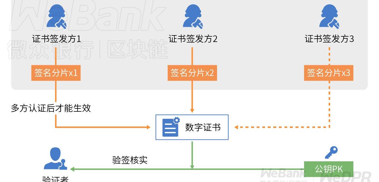 在证书签发过程中,使用门限签名算法,使得一个有效的数字证书必须获得来自不少于门限个数的签名分片才能生效。同时,证书的验证过程只需要使用单个合并公钥,所以也不会影响原有的证书验证过程。