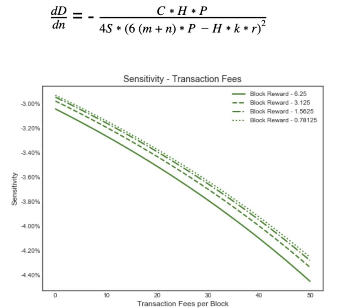 接下来,对于不同coinbase奖励下的每区块平均费用,敏感度情况怎样。随着比特币挖矿的区块奖励按计划减少,交易费在挖矿收入的来源中扮演着更为重要的角色。S19Pro矿机的敏感度如下: