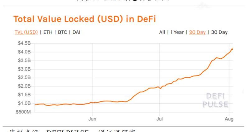 除DeFi通证市值外,DeFi总锁仓价值近两月也增长明显,至今涨幅超300%。
