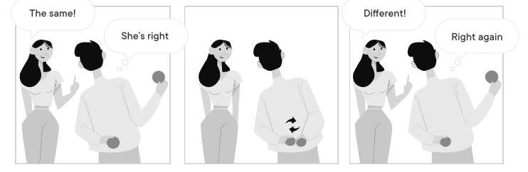 为了向Victor证明两个球的区别,Peggy让Victor一手抓着一个球藏在背后,然后反复交换手中的球。每次交换过后,Victor都会向Peggy展示任意一个球,问她这个球是否与上个球不同。