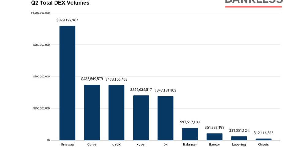 考虑到这一点,按季度交易量计算,排名第一的是Kyber和0x,它们在第二季度的交易量分别达到3.52亿美元和3.47亿美元。