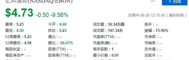 亿邦国际(EBON)开盘跌破发行价 现报4.75美元:亿邦国际今日在纳斯达克上市,亿邦国际 (EBON)初始发行价5.23美元,开盘即跌破发行价,最低报4.50美元,现报4.75美元/股,日内跌幅9.18%。[2020/6/27]
