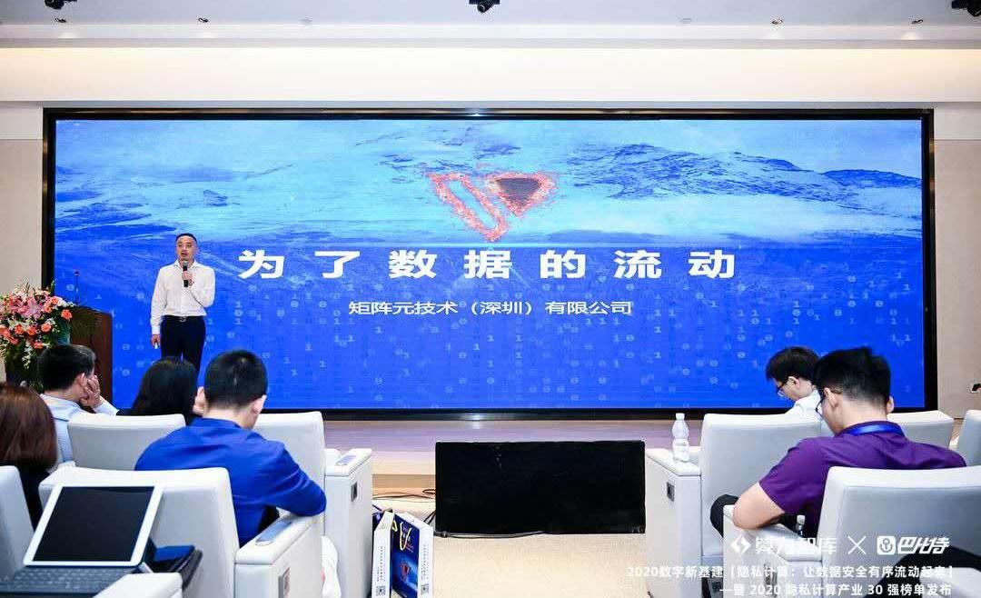 7月5日,杭州区块链国际周分论坛顺利开幕。此次论坛由算力智库联合巴比特、海南省大数据管理局、上海人工智能发展联盟、长三角大数据产业合作联席会议、新财富等共同举办,论坛汇聚了国内外近几年来在隐私数据与安全计算领域专注耕耘的大厂、金融机构与科技企业重磅嘉宾与专家首次云集,共享数据应用思辩饕餮盛宴,同时,还颁发了2020隐私计算产业30强榜单。在分论坛中,矩阵元COO谢红军做了题为《隐私计算是为数据定价的基础和方法论》的主题演讲,分享矩阵元在隐私计算研究的方向,包括跨域的数字身份、数据安全共享、数字地址、数据安全匹配、多方联合建模以及安全模型的应用这六方面内容。