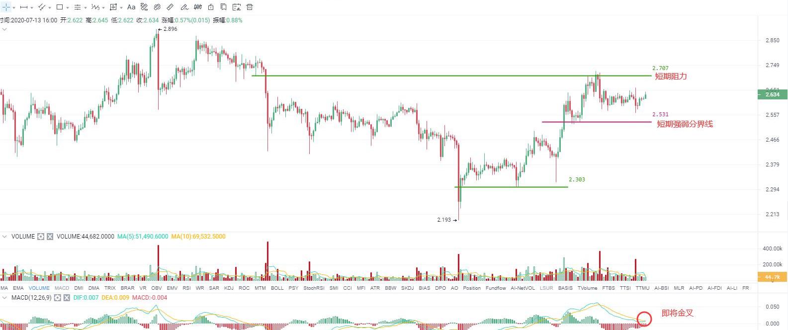 上周我们着重提示关注的2.53-2.7区间依然是短期需要重点关注的潜在波动区间,从目前走势结构以及量价关系来看,短期脱离该区间概率偏小。图中MACD指标区域所标记的即将金叉迹象,预示价格短线继续上涨概率更大一些。激进型投资者可以考虑小仓位去博弈潜在的反弹行情延续,不过不要期望过高,2.7一线即是强阻力区域。
