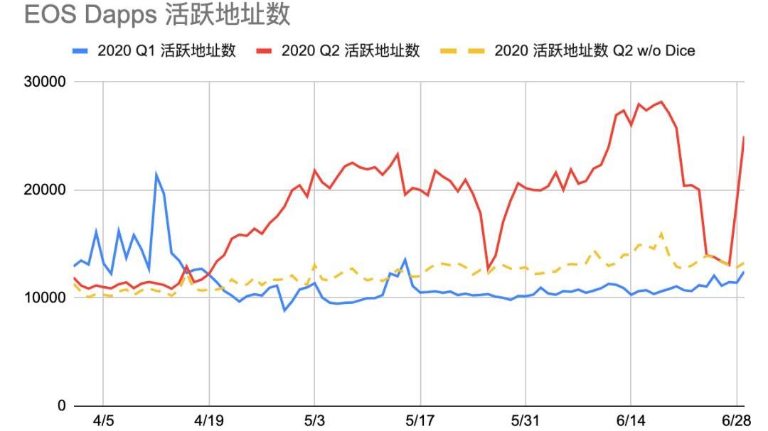 EOS第二季度Dapp总交易额为20.2亿美元,环比(Q1:17.5亿美元)增长16.65%。第二季度EOS日均活跃地址数为18,520,环比增长62.27%,值得一提的是由于很多Dapps使用机器人小号去进行数据的造假,这些日均活跃地址中仍旧有不少水分。