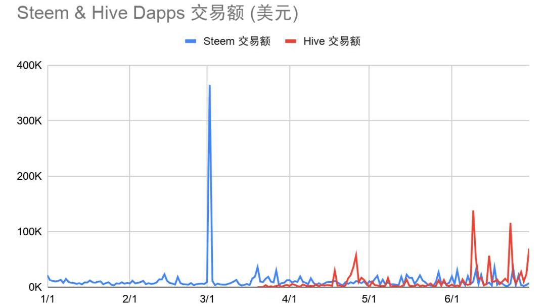 Hive是Steem在被波场基金会收购后分叉出的一条链。3月20日Hive主网上线后,多个SteemDapp迁移/复制到了Hive上。原Steem链上最大的游戏DappSplinterlands在6月1号迁移到了Hive上,使得Hive上的日均活跃用户增长了136.2%,而Steem的日均活跃用户减少了58.8%。