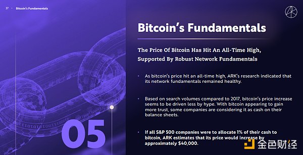 值得注意的是,其中第5和第6个“Big Ideas”都是比特币方面的内容,分别从比特币基本面以及机构对比特币的配置方面阐述比特币。ARK认为,比特币市场和投资者群体正在走向成熟,比特币应该在机构的投资组合中得到战略性的配置。而且机构投资可能对比特币价格有实质性影响。ARK分析发现,如果所有标准普尔500强公司都将1%的现金用于比特币,比特币价格将上涨约4万美元;机构投资者在2.5%至6.5%之间配置其资产,可能让比特币的价格升至20万美元到50万美元。