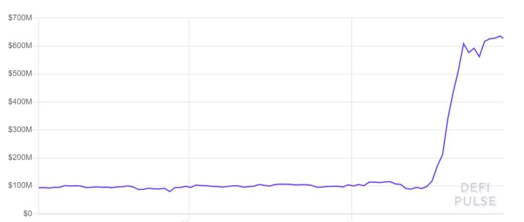 这轮DeFi的大热,归功于COMP,把DeFi的市值从20亿美金,推向了60亿美金。DeFi中的锁仓也推向新的台阶。如下图,为DeFi的锁仓总价值,从曲线上看,开始进入阶段性平稳期。