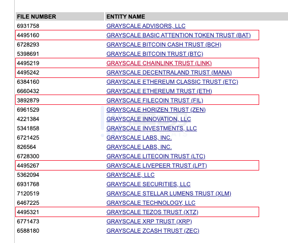 经查询特拉华州政府官网,出现了疑似与灰度(Grayscale)有关的信托实体,分别为「GRAYSCALE BASIC ATTENTION TOKEN TRUST (BAT)」、「GRAYSCALE CHAINLINK TRUST (LINK)」、「GRAYSCALE DECENTRALAND TRUST (MANA)」、「GRAYSCALE FILECOIN TRUST (FIL)」、「GRAYSCALE LIVEPEER TRUST (LPT)」、「GRAYSCALE TEZOS TRUST (XTZ)」六个信托实体(Entity)。
