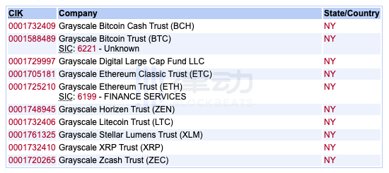 同时,该网站也显示了灰度现有的同名信托实体,包括「GRAYSCALE BITCOIN TRUST (BTC)」、「GRAYSCALE BITCOIN CASH TRUST (BCH)」、「GRAYSCALE ETHEREUM CLASSIC TRUST (ETC)」、「GRAYSCALE ETHEREUM TRUST (ETH)」、「GRAYSCALE HORIZEN TRUST (ZEN)」、「GRAYSCALE LITECOIN TRUST (LTC)」、「GRAYSCALE STELLAR LUMENS TRUST (XLM)」、「GRAYSCALE XRP TRUST (XRP)」、「GRAYSCALE ZCASH TRUST (ZEC)」。