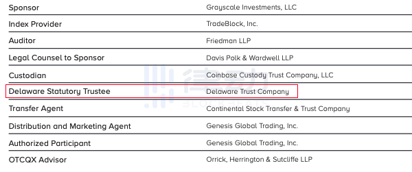 不过,根据灰度官方资料显示,灰度投资备案的登记代理人是特拉华州信托公司(Delaware Trust Company),这是一家受监管的公司信托和代理服务提供商。根据特拉华州法律要求,每个法定实体都必须使用一家登记代理人,以保证能够在营业时间接收法律文件。
