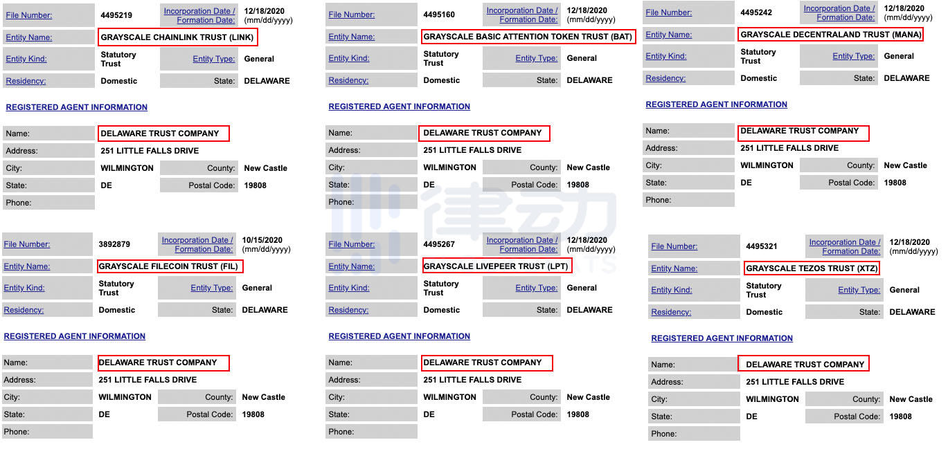 同时,律动 BlockBeats 查询,新增加的六大信托实体皆通过特拉华州信托公司进行登记代理,并且注册时间均为 2020 年 12 月 18 日。