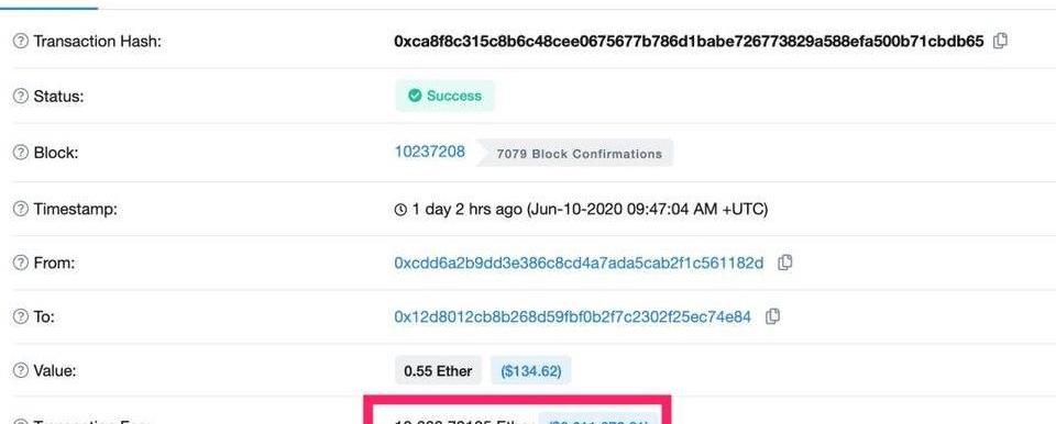 2019年02月19日,以太坊链上惊现一笔只有0.1ETH的交易,然而交易者却给出了高达2,100个ETH的手续费,按当时ETH969元一枚计算,该笔意外操作,让打包这笔交易的矿工意外收获了约200万人民币。