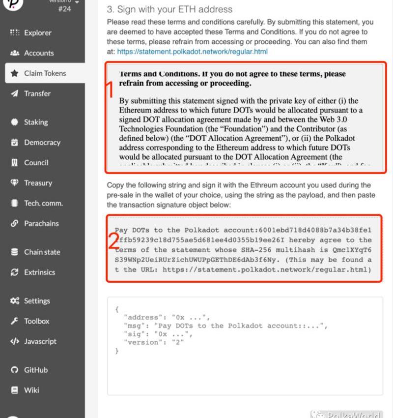3.?显示如下图,1部分是DOT分配条款,可以下拉阅读;2部分是自动生成的一串字符信息,包括你的DOT公钥地址和你需要声明的DOT分配条款信息,这两个动作“claim”和“attest”?是在一个交易里完成的。所以你需要点击2部分,就会直接复制好这串字符。