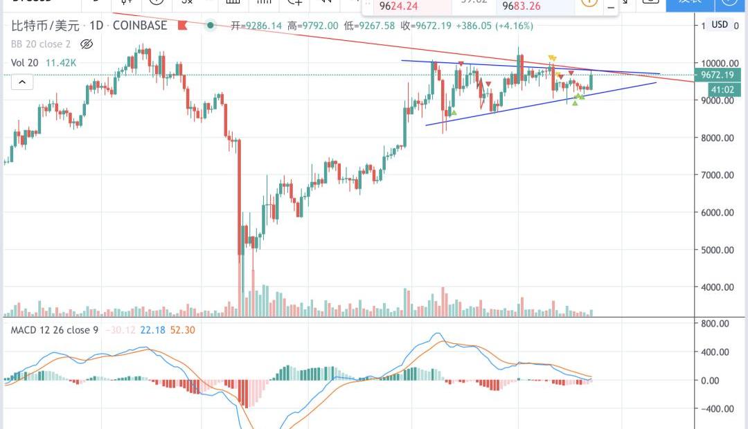 昨晚BTC在三角收敛区间的下边界反弹,从低点9267美金转阴为阳,一路上涨到三角上边界9800美金附近,虽然绝对涨幅不大,但在近日来看这个涨幅已经算是不小的阳线!昨晚这波神转折也将MACD中DIF和零轴的死叉一下解除,而且MACD借此机会彻底完成了零轴的回归。如果方向再度选择向上,短期内基本不会出现背离。
