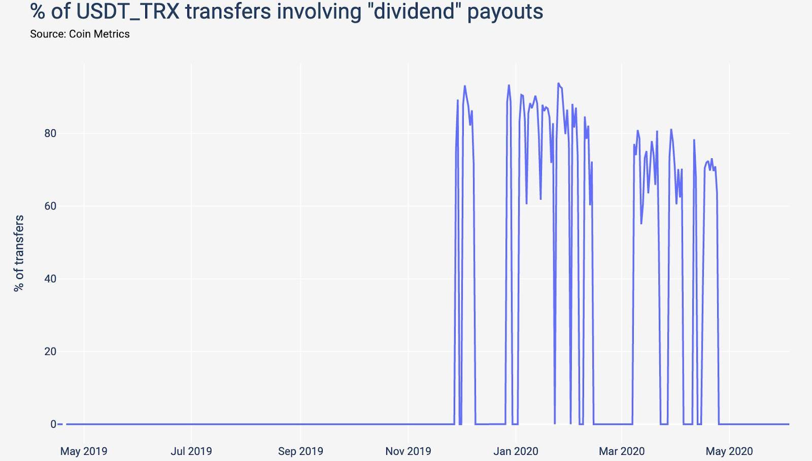 另一个有趣的发现是,Tron账户上最活跃的Tether与“分红”支付相关。在一些日子里,这种活动占到了Tron稳定币转移的90%以上。