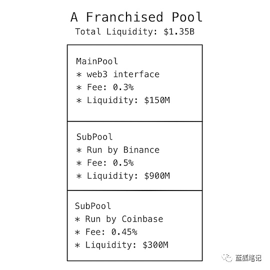 特许经营池是Sushiswap的流动性的扩展计划,一些交易所(如币安)通过集成sushi协议,为其用户提供作为流动性提供者的收益。流动性代币添加到第三方的平台,也即是subpool,subpool会汇入mainpool,也就是会汇入sushiswap的整体流动性中。