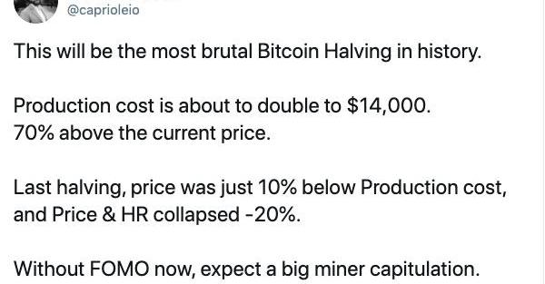 Edwards?表示:“在上一次减半中,价格只比生产成本低了10%,那时价格和算力暴跌了20%。如果现在没有‘FOMO’情绪的话,预计会有超过30%的矿工投降。”