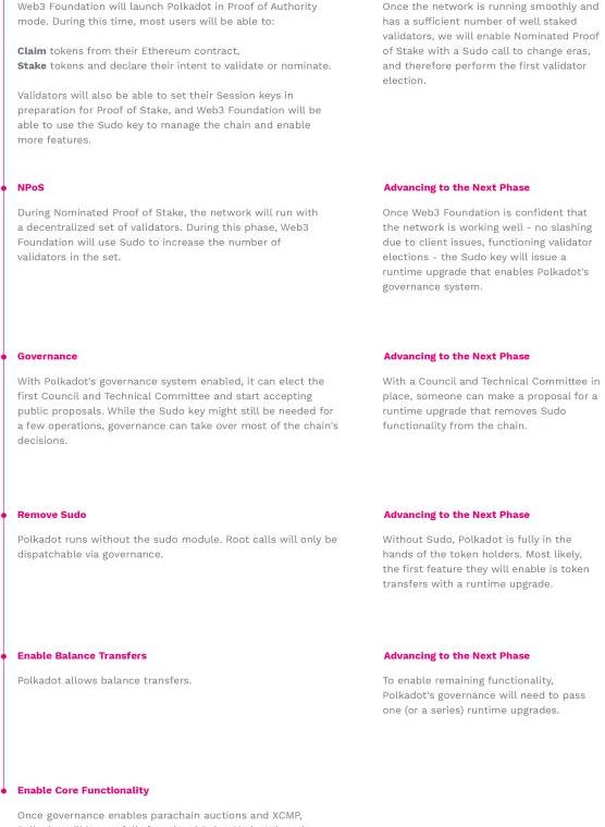 Polkadot最后的发布阶段为解锁剩余功能。移除Sudo后的第一个升级可能是在网络中启用余额转移功能。之后,治理提案将解锁Polkadot的其余核心功能,如构建第一条平行链以及允许跨链消息传递。