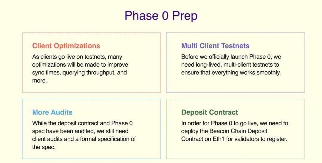 这一部分介绍了为实现Phase0还剩下的工作:客户端最优化、多客户端测试网、更充分的审计以及放在Eth1主网上的保证金合约。