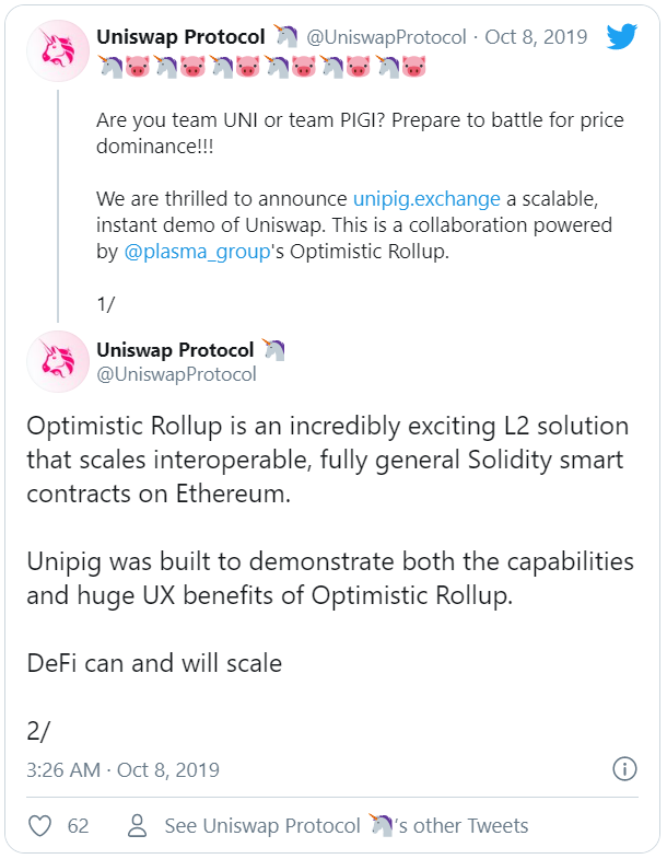 Uniswap V3的第一个预期功能是通过使用Layer2的扩容解决方案来实现更快,更便宜的交易。在2019年10月,Uniswap创建了一个交易演示,展示了Optimistic Rollups如何扩容交易。它的手续费将低至不到一美分,而交易时间也仅用不到一分钟。该演示目前已经不再有效,这可能表明Uniswap正在准备将其引入其主要平台。