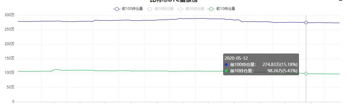 0512比特币减半之后,比特币前10持仓量和前100持仓量并没有特别明显的变化。比特币前100持仓量在2月20日出现过一次明显的增加,并在4月初达到了一个小峰值,之后不断减少。目前,比特币前100持仓量为15.12%,较前一峰值出现了近1%的减少,这主要是近期交易平台地址的不断流出造成的。