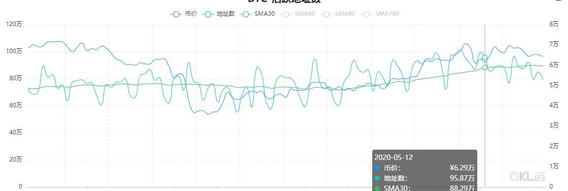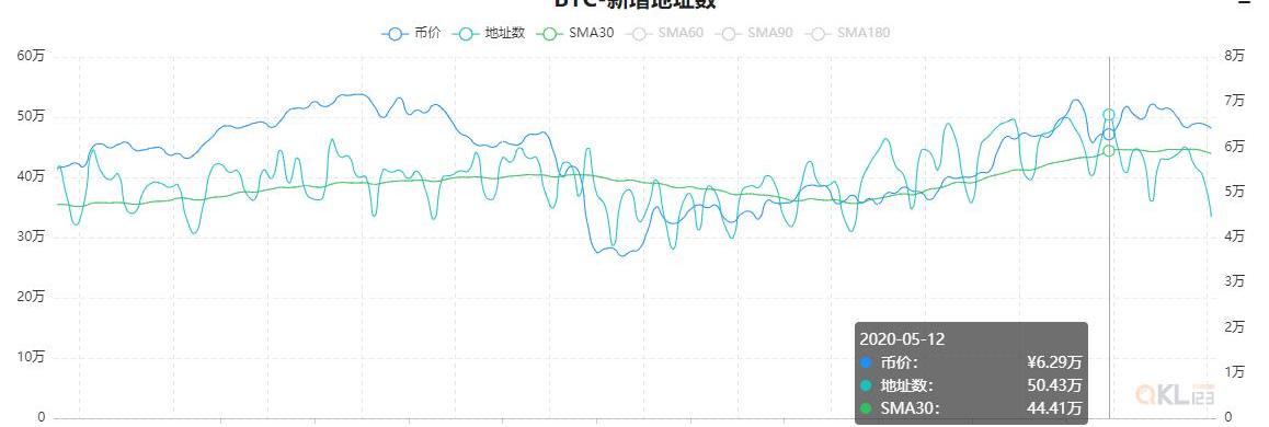 新增地址数可以间接反映比特币新增用户情况。在0312大跌之前和0512减半之前,比特币新增地址数都出现了一次明显增加,前者可能主要是受前期价格上涨的预期带动,后者可能是受到比特币减半的舆情热度带动。到0512减半当天,新增地址数达到50万,逼近一年来高点,且30日新增地址数创近年新高,但目前有所回落。