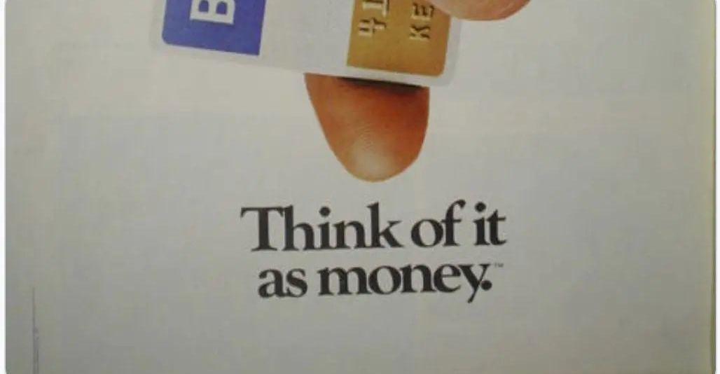 下方这个1970年代早期的Visa广告语?(“Thinkofitasmoney”)?有没有让你想起什么?