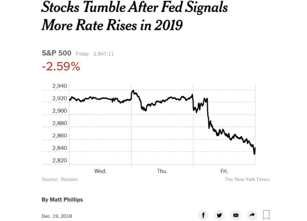 如上图所示,在刚刚过去的2018年,美国股市经历了大萧条以来最糟糕的12月。而这一切都是因为美联储试图把利率调回至上一轮经济危机之前的水平,仅此而已。而这波市场的「崩溃式」反应促使美联储在不久前,进行了十年来首度降息操作。
