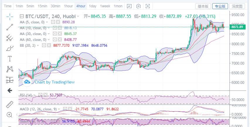 四小时图上看,K线两波上下插针,价格再次回到了8800上方区域,但是由于多头力度不足,价格并未回到布林带中上轨区域,目前多空双方斗战旗鼓相当,价格在在8860位置附近陷入胶着。局势目前保持高位震荡,价格上行打破中轨线阻力,那么积累能量将会得到释放,有机会在晚间再度出现一波上涨。附图各项指标保持平缓,均线缓慢运行