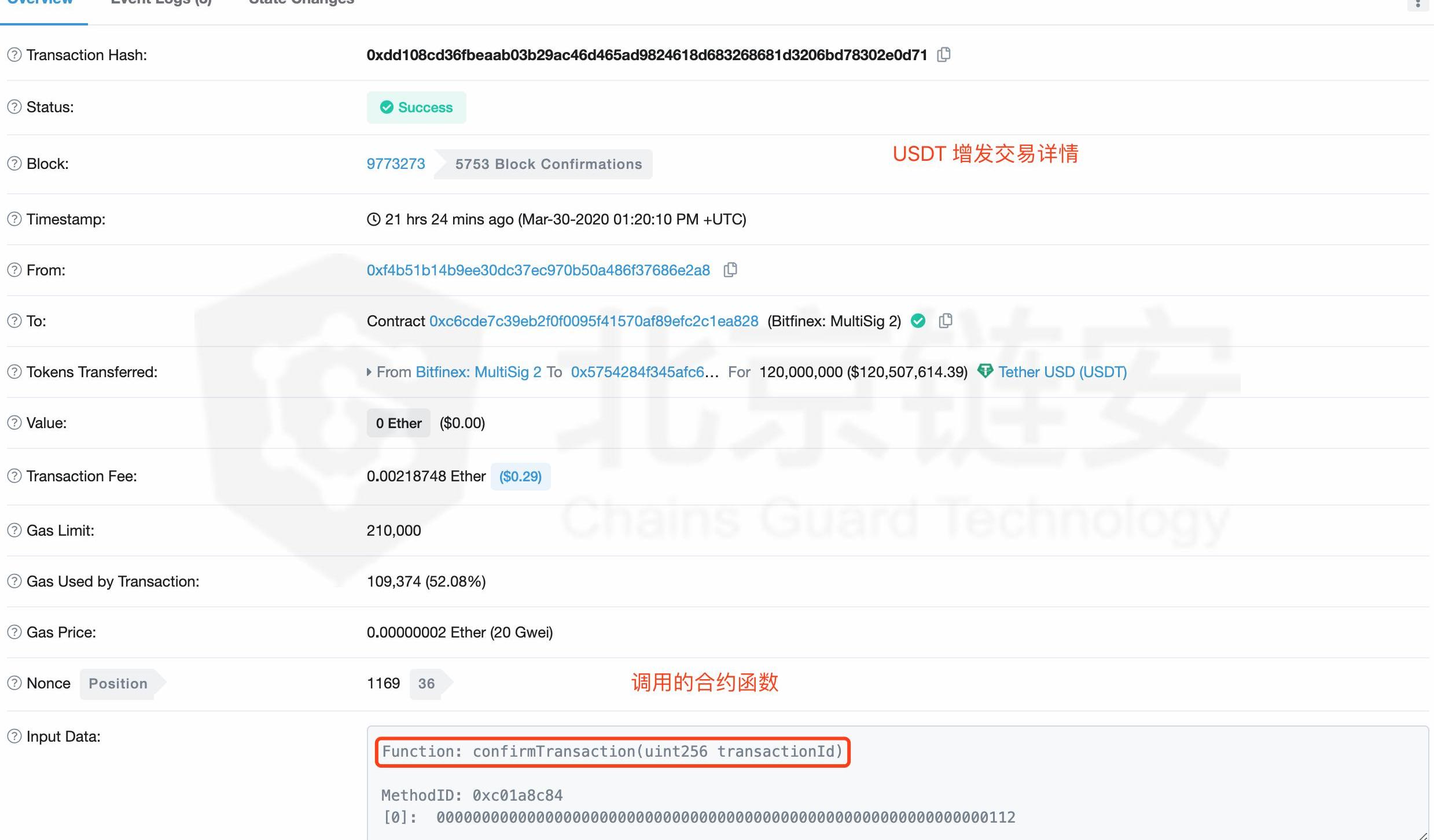 可以看到在上图交易详情中并没有调用TetherToken合约的issue(uint)?增发函数,而是调用了MultiSigWallet合约的confirmTransaction(uint)?函数完成的增发操作。
