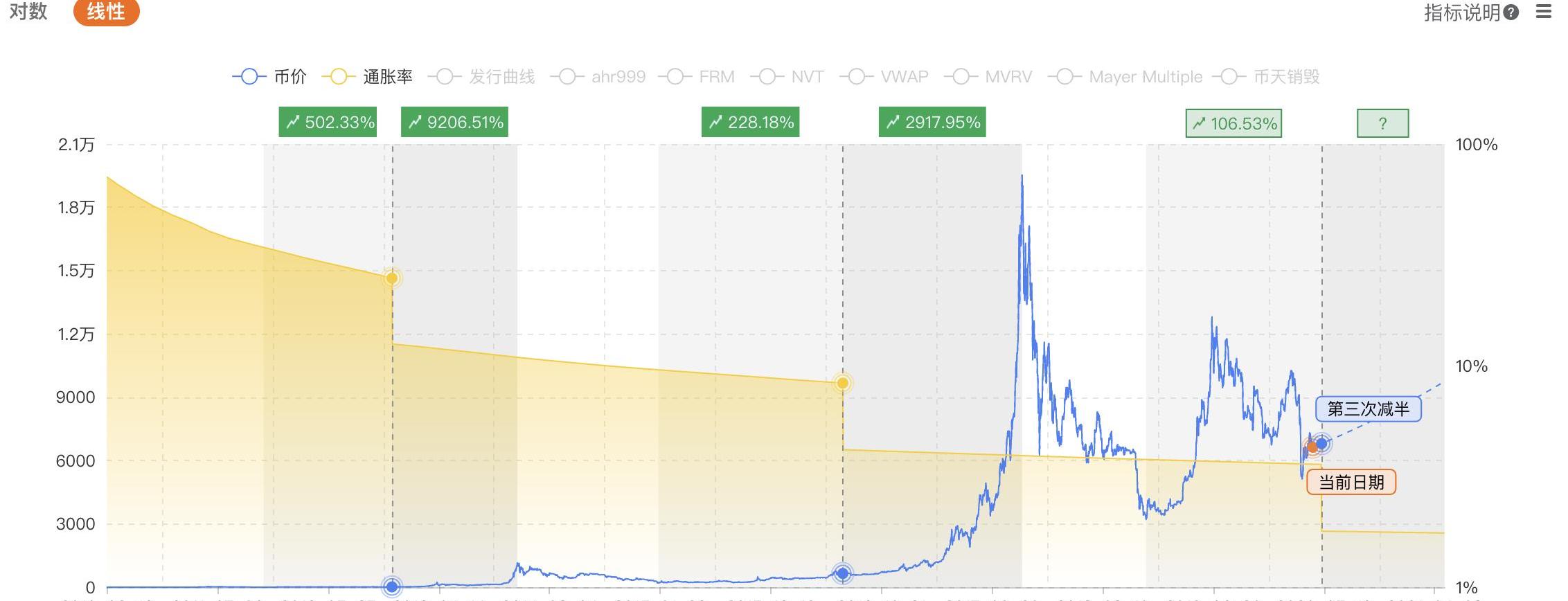 2020年初,“减半行情”是中国加密社区热度最高的词。几大“国产”数据网站,如非小号、MyToken、QKL123等,都针对减半做起了文章,纷纷开设了减产币种专题。QKL123的减半页尤为细致,一张图表画出了比特币历史上每一次减半的各种数据变化,甚至还有囤币指标、FRM、NVT、MVRV等专业指标。