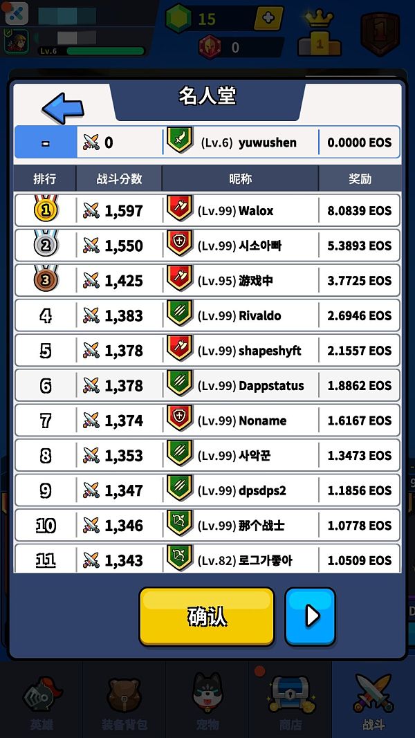 2. PVP排行榜:根据PVP成绩排名,瓜分EOS奖池。