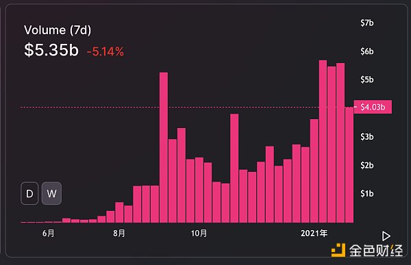 在defi锁仓排名中目前排名第三。除了锁仓,Uniswap交易量也屡创新高。2021年,Uniswap交易量单周突破55亿美元。