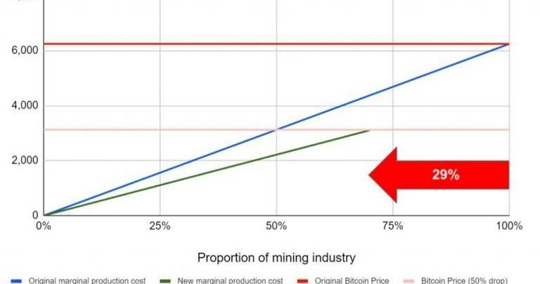 类似地,第二条成本曲线是一条“正常”曲线,显示在减半后哈希率下降了47%。对于第三条曲线,哈希率只下降了12%。