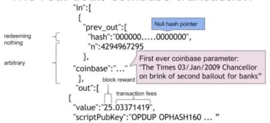 2009年1月4日,中本聪在创世区块上面的CoinBase留言