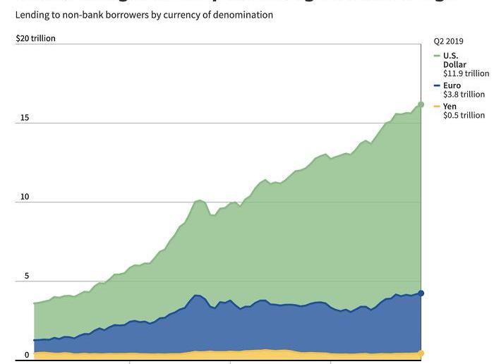 上图是国际清算银行、RitvikCarvalho、MarcJones推出的全球非银行外币借贷增长走势图。